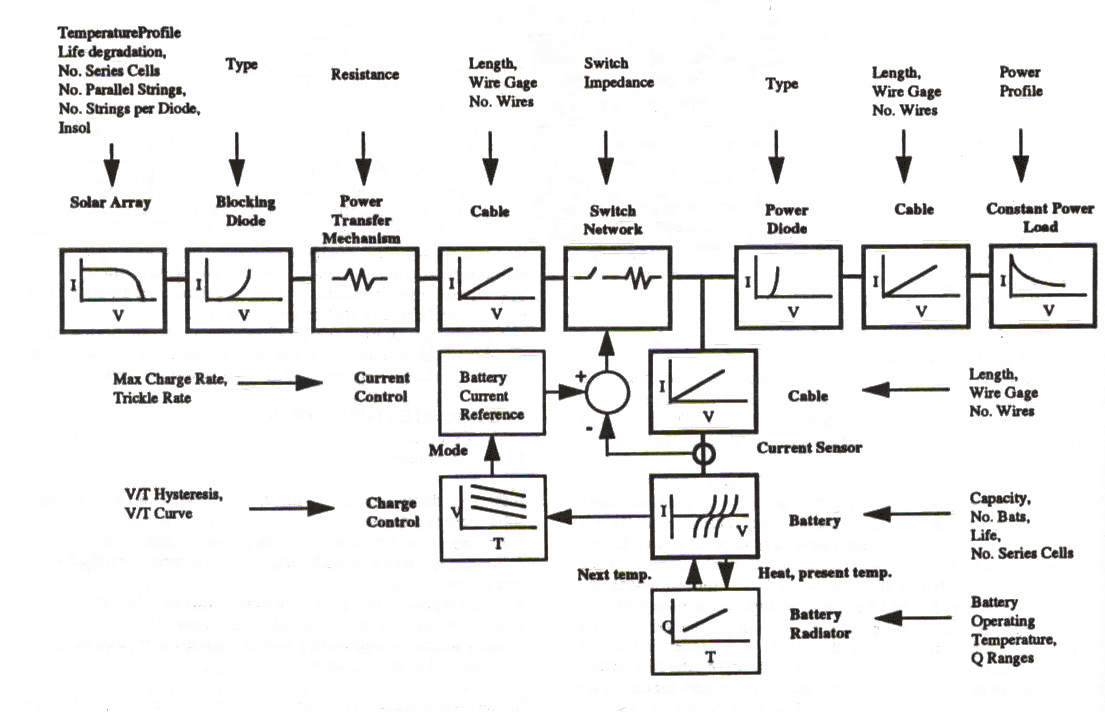 Each of the EPS components shown in Figure 1 are now summarized, including a listing of all of the input and output parameters which define that particular component. Mission and orbital characteristics are included to provide the sunlight and eclipse driving functions to particular component models.