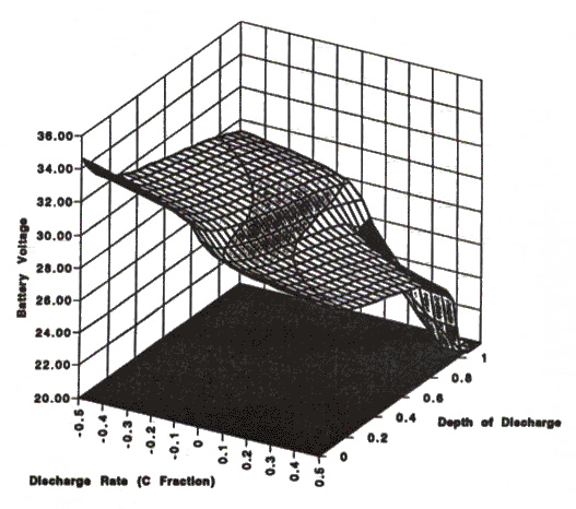 The battery component model allows the use of a 2-D characteristic surface to model the battery voltage as a function of both the depth-of-discharge and the discharge-rate at a specific temperature. The battery model accepts both life aging parameters and run-time parameters. Life adjustments are made for calendar life, cycle life, average life temperature and average life depth of discharge. Run time parameters include instantaneous current, instantaneous temperature, and instantaneous depth of discharge. Outputs include instantaneous voltage and instantaneous charge efficiency, and are adjusted according to certain low frequency time dependent behaviors of batteries. Figure 3 illustrates an example battery voltage as a function of rate and depth of discharge, with temperature held constant, life degradation set to beginning of life, and low frequency time dynamic effects assumed to be timed out (e.g. DC rather than dynamic conditions).