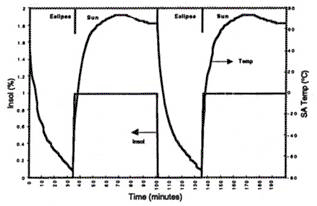 A battery dominated bus architecture with a sun-tracking solar array is modeled with no solar array switching for two orbital cycles of 100 minutes each. Each cycle consists of 35 minutes eclipse followed by 65 minutes of sunlight. The percent amount of light impacting perpendicular to the solar array (Insol), and the resulting solar array temperature for these two orbits is shown in Figure 5. It is noted that the solar array temperature varies greatly, from about -75 C to about +75 C during these cycles.