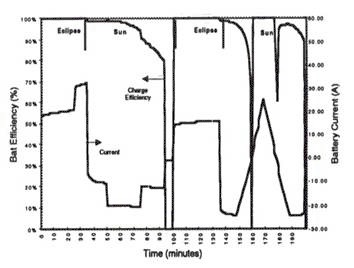 The load power required for the Bus, Communications, and Payload as chosen for this study are shown in Figure 6. The upper curve represents the total power required from the EPS. This power profile was chosen to demonstrate the effect of having two payload power pulses during the first orbit (one beginning in eclipse), and a large 3X over-power pulse (triangular) during the second cycle. The resulting battery current required to compensate for the total load and the battery charging efficiency are shown in Figure 7. It is seen that in both cycles, the battery supports the load during the eclipse, and recharges in the sunlight, and follows the shape of the required load power.