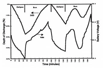Figure 8. Representative EPS Transient Results. Battery DOD (%) and Voltage