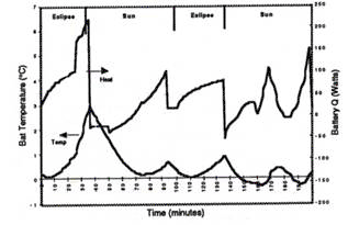 The resulting battery voltage and the battery depth-of-discharge (from 0%) are both shown in Figure 8. It is seen that the battery discharges and recharges based on the summation (integral) of the load power times insol, and that the battery fully recharges before the end of each cycle (As supported by a zero battery current after the battery is fully recharged, as seen in Figure 7.). It is also seen that the battery voltage varies quite strongly during this transient, as much as nearly ten volts during these two cycles. It is recalled that the battery voltage is part of the non-linear response of the battery that is solved for and converged during each time step during this analysis. The resulting battery temperature and heat created are shown in Figure 9. Although the temperature of the battery is shown to vary only a few degrees, the heat that the battery generates is as much as 220 Watts during the first eclipse cycle.